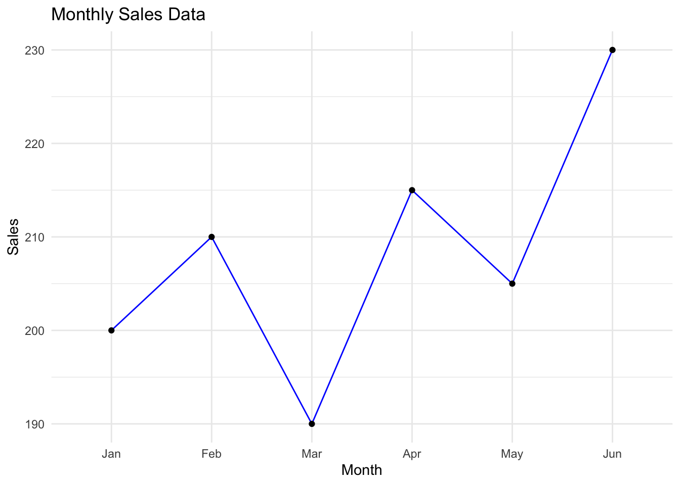 library(ggplot2)# Create a data frame with monthly sales datadata<-data.frame( Month =factor(c('Jan', 'Feb', 'Mar', 'Apr', 'May', 'Jun'), levels =c('Jan', 'Feb', 'Mar', 'Apr', 'May', 'Jun')), Sales =c(200, 210, 190, 215, 205, 230))# Plotting the line graphggplot(data, aes(x=Month, y=Sales))+geom_line(group=1, colour="blue")+geom_point()+labs(title="Monthly Sales Data", x="Month", y="Sales")+theme_minimal()
