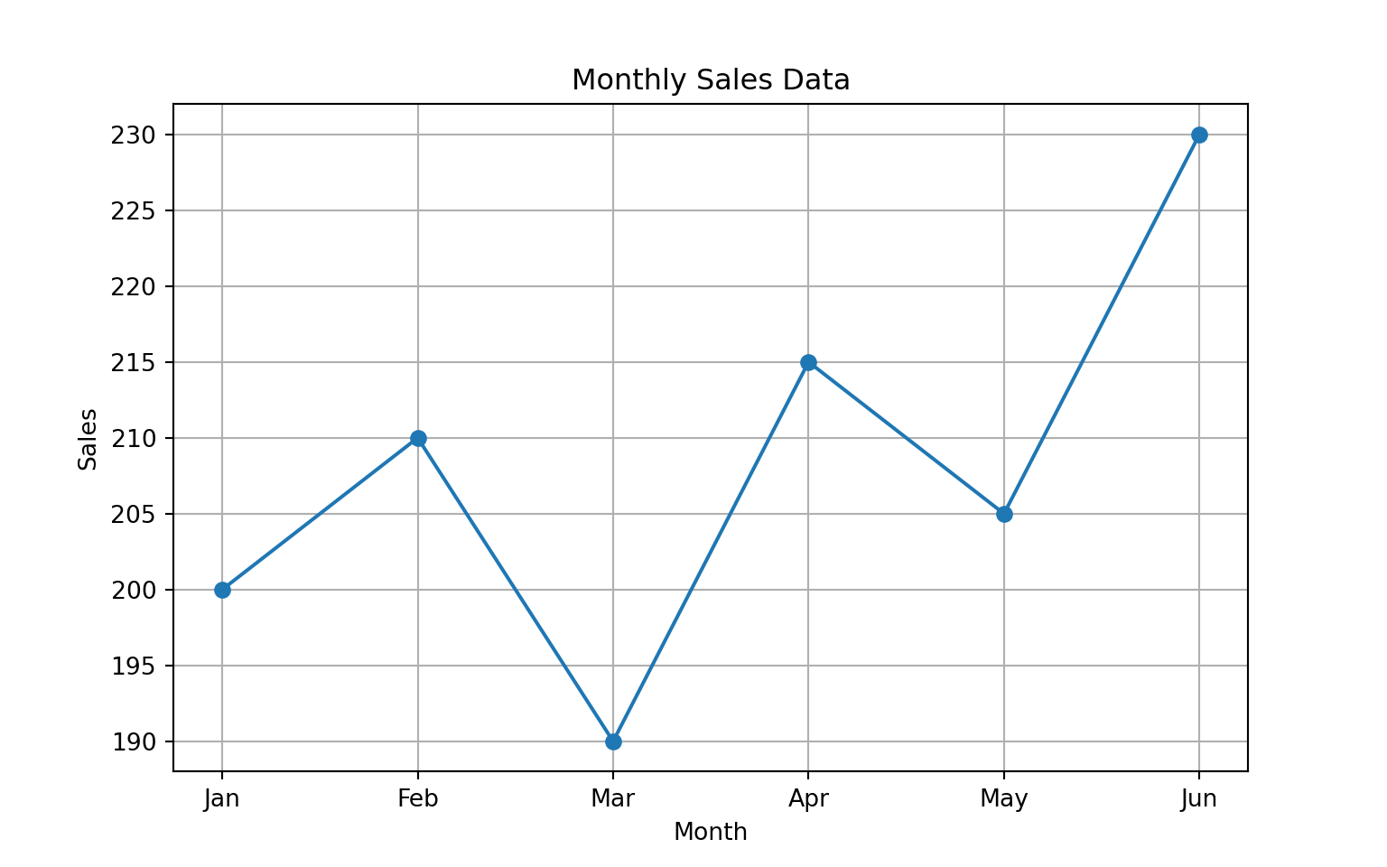import pandas as pdimport matplotlib.pyplot as plt# Create a DataFrame with monthly sales datadata = {'Month': ['Jan', 'Feb', 'Mar', 'Apr', 'May', 'Jun'],'Sales': [200, 210, 190, 215, 205, 230]}df = pd.DataFrame(data)# Plotting the line graphplt.figure(figsize=(8, 5))plt.plot(df['Month'], df['Sales'], marker='o')plt.title('Monthly Sales Data')plt.xlabel('Month')plt.ylabel('Sales')plt.grid(True)plt.show()